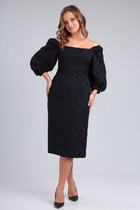 Платье полуприлегающего силуэта, без воротника, с V-образным вырезом горловины, с центральной застежкой на петли и пуговицы по лифу переда. Платье с втачным поясом. По спинке пояс присборен на венгерку. По переду лиф и юбка присборены по шву притачивания к поясу. В боковых швах расположены карманы. Рукав короткий, цельнокроенный. Плечо спущенное, со сборкой. Платье без подкладки.