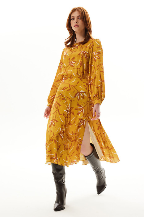 Платье без воротника, с круглым вырезом горловины, застежкой на потайную молнию в среднем шве спинки. Платье отрезное по линии талии. Верхняя часть переда со сборкой в области груди. Спинка со средним швом, талиевыми вытачками по верхней части. Нижняя часть переда с асимметричным рельефным швом, заканчивающимся разрезом.