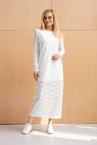 Вязаное платье прямого покроя полуприлегающего силуэта длиной до середины бедра (про росте 170 и Ог и Об соответствующих по ГОСТ 17522-72). Рукав втачной прямого покроя стандартной длины. Линия плеча немного спущенная. Вырез горловины круглый с имитацией "поло" без застёжки и широким отложным воротником.