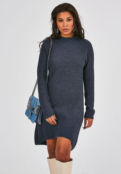 Это модное вязаное платье с А-образным силуэтом представляет собой утонченное сочетание стиля, простоты и комфорта. Его длина создает интересный и изысканный контраст, достигая середины бедра спереди и колена сзади, что придает образу кокетливый, но изящный вид. Свободный рукав реглан-погон уравновешивает силуэт. Вырез горловины округлой формы с цельновязанным воротником стойкой дополняет образ, придавая ему стильный завершенный вид. Это платье идеально подойдет как для повседневного использования, так и для особых случаев, подчеркивая ваше неповторимое чувство вкуса.