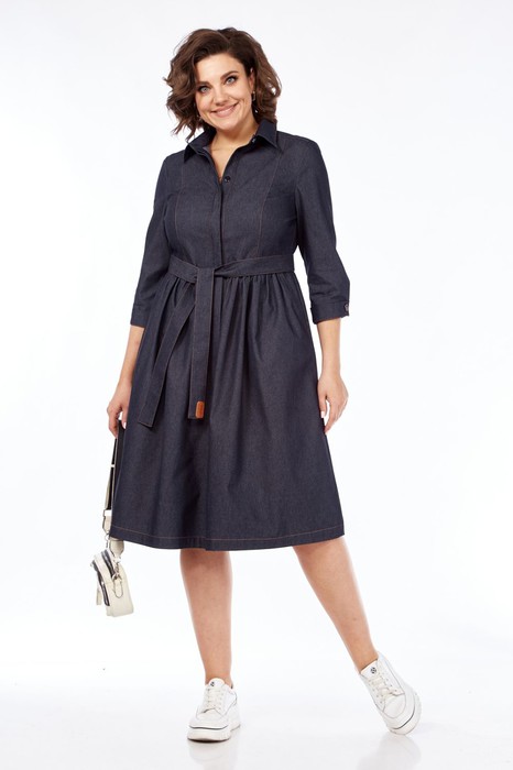 Элегантное женское платье полуприлегающего силуэта, классической длины, отрезное по линии талии со сборкой, изготовлено из хлопковой джинсовой ткани. Горловина оформлена рубашечным воротником со стойкой, центральная потайная  застежка планки на петли-пуговицы. Перед изделия с рельефами в верхней части и боковыми карманами по юбке, спинка с талиевыми вытачками. Рукава с цельнокроенным манжетом и декоративными пуговицами контрастного цвета. Можно снять пуговицы и ширина рукава по низу увеличится на 3см. В комплекте идет пояс из основной ткани. Платье будет комфортно для любого типа фигуры. Длина рукава – 46см, длина изделия – 103см.