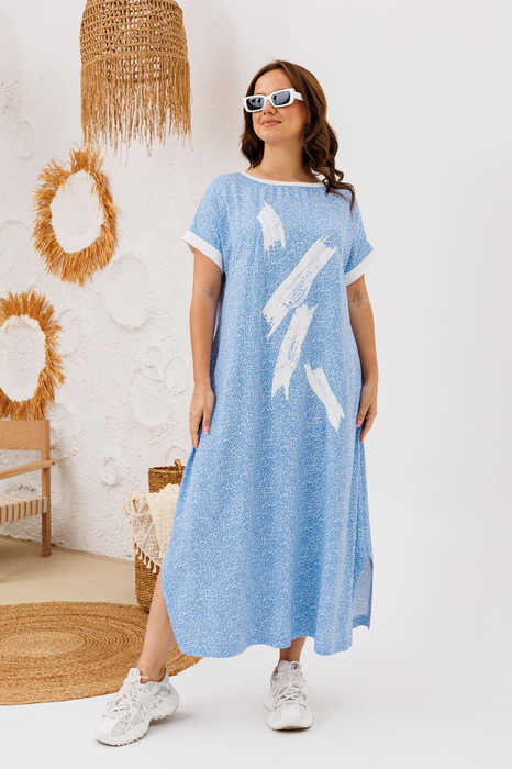 Платье женское свободного силуэта в стиле «боххо», вырез горловины округлый с декоративной трикотажной резинкой. Изделие без рукава со спущенной линией плеча и отделкой по низу. В боковых швах карманы и фигурные разрезы по низу. Декором является принт по полочке. По спинке – имитация планки с пуговицами. Платье без застежки. Длина платья 122 см.