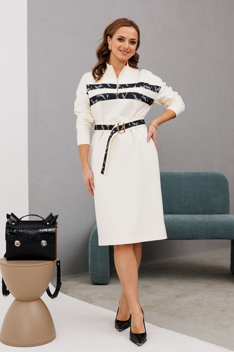 Платье женское, полуприлегающего силуэта.  Вырез горловины со стойкой и застежкой на тесьму-молнию. Рукав втачной, длинный. По спинке разрез в среднем шве. В комплекте съемный пояс из основной и декоративной ткани.
