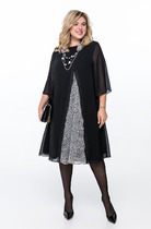 Платье- рубашка свободного силуэта, комбинированно из двух тканей. Вырез горловины рубашечного типа, застежка на петли и пуговицы по переду. В боковых швах карманы, по переду кокетка и клапаны. В комплекте ремень из основной ткани. Рукав длинный на манжете внизу.