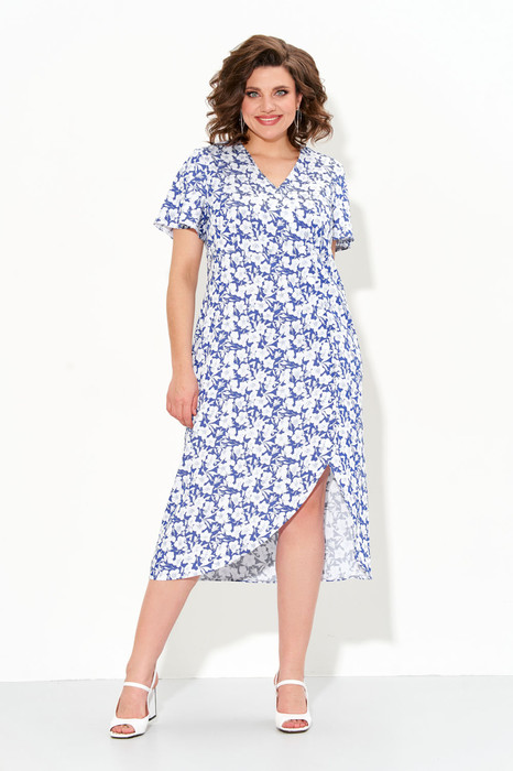 Платье женское полуприлегающего силуэта без подкладки из натуральной ткани со втачными рукавами и V-образным вырезом горловины. По переду платья декоративная планка, в боком шве застежка-молния.