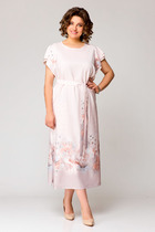 Женское нарядное платье A-силуэта из шифона на мягкой эластичной подкладке с антистатическим эффектом. По переду платья отрезные кокетки с небольшой сборкой,  V-образная  горловина с декоративными завязками, по низу - отрезной валан, придающий воздушность.  Длина 112 см, длина рукава 30-32 см.