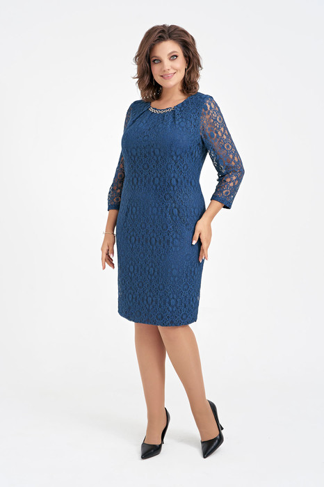 Кружевное женское платье полуприлегающего силуэта на трикотажной подкладке со втачными рукавами и небольшими декоративными складками по горловине, застежка сзади на тесьму-молнию. В комплекте съемное украшение.