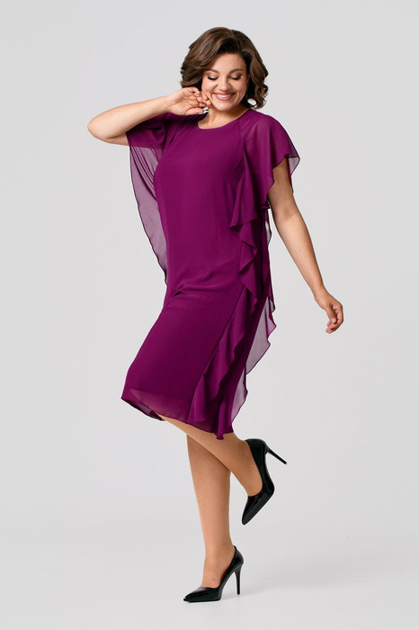 Платье женское прямого силуэта из легкой шифоновой ткани на подкладке из трикотажного полотна с антистатическим эффектом; рукава реглан, переходящие в декоративные воланы по переду и спинке.                                                                                                              Рекомендована стирка при t не выше 30 С, глажение при t  прессующей поверхности не выше 110 С. Длина 103 см.