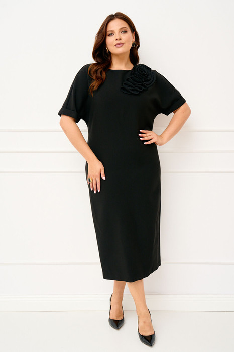 Женское платье полуприлегающего силуэта выполнено из плательной ткани со втачными  рукавами и  декоративным несъемным цветком; по спинке вырез в виде "капельки", который застегивается на петлю и пуговицу; по низу -  шлица.