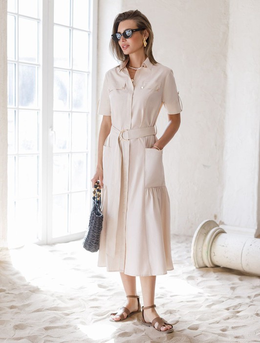 Состав: 100%Хлопок Параметры модели на первом фото: Рост 170, бюст 89, талия 63, бедра 92 Размер товара на первом фото: 42Платье-рубашка выполнено из легкого хлопкового поплина. Модель с воздушной юбкой-воланном дополнена крупными накладными карманами и поясом из основного полотна с золотистой фурнитурой. Благодаря силуэту в стиле new-look изделие моментально сделает образ женственным и романтичным. Натуральный состав ткани обладает высокой воздухопроницаемостью и гигроскопичностью. В изделии будет комфортно, даже в самое жаркое время года. Подходит для любой фигуры.