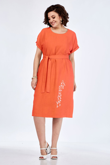 Платье женское прямого силуэта из плательной ткани. По переду нагрудные вытачки. Внизу-печать. По спинке фигурный вырез, складки и печать по центральной детали. В боковых швах карманы и разрезы внизу. Горловина круглой формы. Рукав спущенный с притачной манжетой.