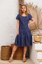 Платье женское, нарядное выполнено из плательной ткани, А-силуэта. Изделие отрезное по линии талии и собрано на эластичную тесьму. По центру лифа складка декорированная пуговицами. Верхняя часть спинки цельная. Юбка платья 4х-клинка. В боковых швах обработаны карманы. Рукава втачные двухшовные по переднему шву разрез. Рукава на манжете с застежкой на две петли с пуговицами. Нижняя часть платья на подкладке. К изделию прилагается ремень.