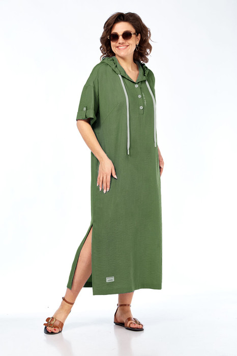 Платье женское, свободного силуэта, выполнено из вискозной ткани с эффектом мятости. Платье с капюшоном, по переду обработаны вытачки и планка с застежкой на петли и пуговицы. Спинка отрезная по линии талии, со сборкой в нижней части. Рукава спущенные с отложными манжетами и патами. В боковых швах обработаны карманы и разрезы. Платье декорировано дизайнерской печатью и нашивкой по низу переда.