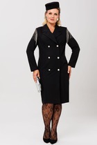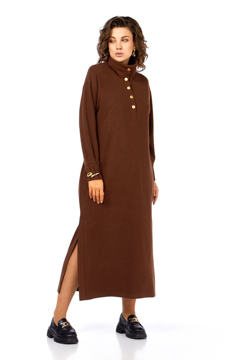 Платье женское прямого силуэта, выполнено из трикотажного полотна. Горловина обработана воротником стойкой, застежка планка на петли и пуговицы. В боковых швах обработаны карманы, по низу шлицы. Рукава спущенные, длинные внизу на манжетах.