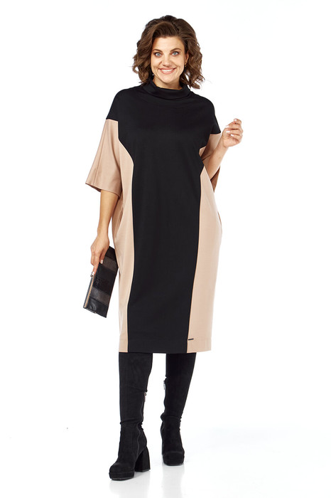 Платье женское свободного силуэта, выполнено путем комбинирования тканей двух цветов, из трикотажного полотна. Изделие с воротником “хомут”. По переду и спинке обработаны фигурные рельефы. Рукава спущенные. В боковых швах имеются карманы.