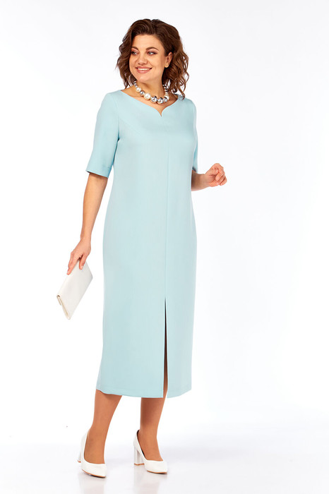 Платье женское , полуприлегающего силуэта, выполнено из плательно-костюмной ткани. Горловина фигурной формы. Перед с нагрудными вытачками и средним швом в котором обработан разрез. Спинка со средним швом. Рукава втачные, одношовные с небольшим разрезом по шву.