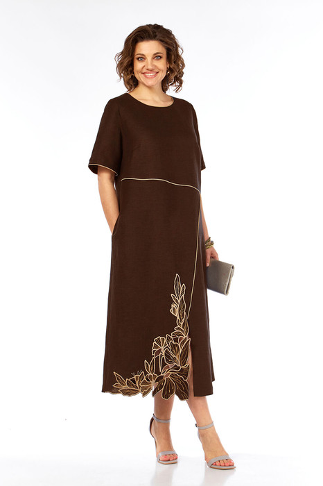 Платье женское, А- силуэта, выполнено из натуральной льняной ткани. Горловина округлой формы, обработана контрастным кантом. Перед с ассиметричными подрезами и нагрудными вытачками. Подрезы выделены контрастным кантом. Спинка со средним швом, в котором обработана застежка на навесную петлю и пуговицу. Рукава втачные. Платье дополнено дизайнерской вышивкой в технике ришелье.