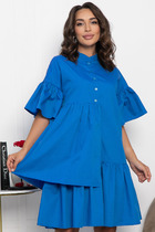 Платье женское полуприлегающего силуэта, отрезное по линии талии. Лиф платья кроя «летучая мышь». Перед лифа цельнокроеный. Спинка лифа цельнокроеная. Горловина лодочкообразной формы. В области плечевых швов застрочены защипы для формирования складок по переду. Низ рукавов обработан притачной манжетой из ткани-компаньона. Перед юбки с декоративными подрезами и имитацией прорезных карманов с листочкой из ткани-компаньона, обработан разрез. Заднее полотнище юбки цельнокроеное.