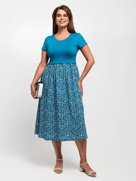 Отрезное по талии в комбинации двух видов в единой цветовой гамме: гладкокрашеного полотна «кулирка» с лайкрой (лиф) и плательной штапельной ткани (юбка) с набивным рисунком, удлиненное, отрезное по талии, с короткими втачными рукавами, горловиной овальной формы, окантованной основным материалом и декоративной планкой в шве соединения лифа с юбкой. Юбка по шву соединения с лифом присборена.