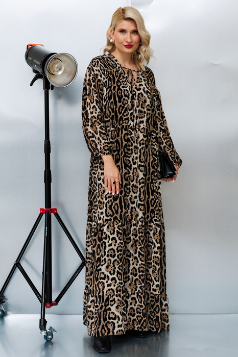 Шифоновое платье длиной макси в леопардовый принт. По переду и спинке в районе талии расположена кулиса, для регулировки обьема по талии. Рукав длинный на резинке.