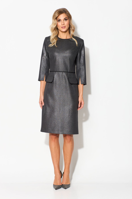 Платье женское, прилегающего силуэта из плательно-костюмной  ткани с серебристым напылением, с втачными рукавами, длиной до коленей, с застежкой на потайную тесьму-молнию в среднем шве спинки. Деталь переда  платья с подрезом на уровне линии талии. Лиф - с отрезными бочками, центральная часть с нагрудными вытачками. Переднее полотнище с 2-мя нагрудными вытачками и с накладными клапанами, клапаны по срезам обработаны отделочным кантом. Деталь спинки платья с плечевыми вытачками, исходящими от горловины, и с талиевыми вытачками, со средним швом, который заканчивается разрезом. Рукава втачные двухшовные,  длиной 3/4, передний шов заканчивается разрезом. Вырез горловины платья округлой формы с втачным отделочным кантом, обработан обтачкой