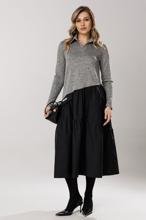 Восхитительное платье свободного А-силуэта с ассиметричным отрезным уклоном по линии талии и притачивания воланов юбки изделия, горловиной в стиле поло. Полочка и спинка платья отрезные по линии талии с ассиметричным уклоном. Верх изделия из трикотажного полотна. Спереди расположены горизонтальные нагрудные вытачки. Горловина платья оформлена V-образным вырезом с заходящими планками и отложным воротником со стойкой, в стиле поло. Глубина выреза 13-14 см. Ширина планок 3 см. Рукав прямой, одношовный, втачной. Линия плеча чуть спущена на 1,5 см. Длина рукава 59-60 см. Длина изделия по спинке 124,126 см (в зависимости от размерного ряда). Юбка платья А-силуэта состоит из двух составных воланов под уклоном на умеренной сборке. На линии соединения талии с юбкой платья с одной стороны переда втачена нефункциональная деталь: клапан с декоративным притачным элементом. В боковом шве юбки расположен внутренний карман. Длина платья по спинке 124-126 см (в зависимости от размерного ряда).