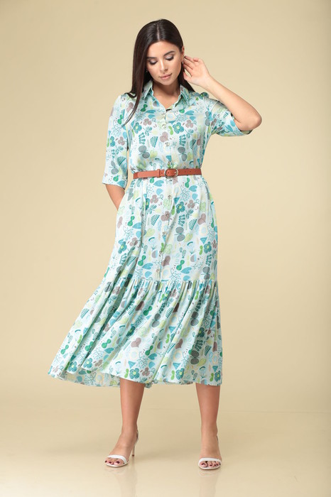 Стильное платье А-силуэта, без подкладки. По переду - нагрудные вытачки, цельнокроеные планки с функциональной застёжкой на петли – пуговицы, в боковых швах – функциональные карманы. Горловина обработана воротником рубашечного типа со стойкой с застёжкой на петлю – пуговицу. По низу платья притачной волан, высотой 40 см. Длина платья по среднему шву спинки для р.46-50 – 122 см, для р.52-56 – 123 см. Рукав – втачной, 1-шовный, с цельнокроеной манжетой. Длина рукава для р.46-50 - 35см, для р.52-56 - 38,5 см.  Декор, пуговицы и ремень, могут отличаться от заявленного на фото. Цвет платья может отличаться на полутон от заявленного на фото.