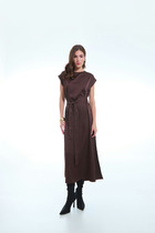 Платье приталенного силуэта, отрезное по линии талии, нижняя часть платья на подкладке. Верхняя часть платья на запахе, с двумя навесными петлями и пуговицами. Вырез горловины V-образный. Рукав длинный, одношовный, длиной до локтя, по окату сборка. По переду и спинке талиевые вытачки. Застежка на потайную молнию в боковом шве.