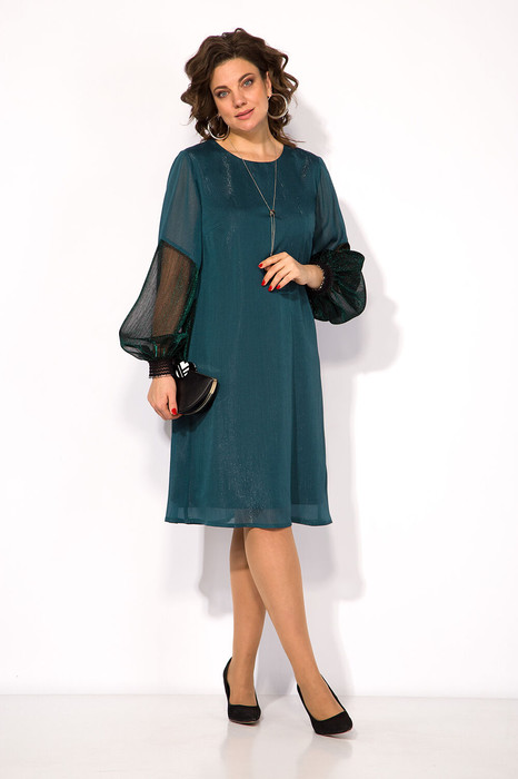 Элегантное, нарядное платье, трапециевидного силуэта в глубоком зеленом оттенке морской волны.  Платье трапециевидного силуэта от линии груди. Вырез горловины округлый.  Эффектный пышный рукав украшает вставка из сетки. Рукав по низу присборен на декоративную резинку. Изюминкой данной модели служит эффектный вырез по спинке, переходящий в бант-завязку!  Платье на стрейчевой трикотажной подкладке. Платье идеально подходит на любой тип фигуры, а дизайнерская вышивка является главным акцентом в данной модели.