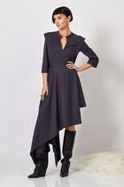 Платье прямого силуэта, длиной ниже колена, со спущенной линией плеча и рукавами на основе цельнокроеного. Спинка и перед с горизонтальной кокеткой. Застежка спереди на планку и петли-пуговицы. Воротник рубашечный на стойке. По линии бёдер диагональный подрез. По переду нижней части платья глубокая складка. Пояс в комплекте.