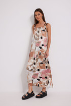 Платье длины миди со свободной юбкой и пришивным по переду поясом. Рукав цельнокроеный. По спинке встречные складки и застёжка по линии горловины на пуговицу. Длина по спинке 125 см