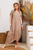 Платье в стиле "Бохо", свободного кроя А- силуэта из легкой, струящейся вискозы. Округлый вырез горловины, вытачки из проймы, в боковых швах карманы. Рукав длинный, съёмный, к изделию привязывается тесемками, которые вставлены в пройму и в рукав. По спинке средний шов, переходящий в застёжку на навесную петлю/пуговицу, и накладные отлетные детали, не доходящие до центра. В комплектацию входит съёмный пояс из экокожи. Платье можно носить как с поясом, так и без него.