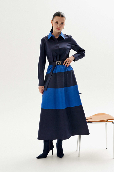 Платье полуприлегающего силуэта выполнено из хлопка в двух цветах: синий и голубой. Рукав втачной, по низу рукава манжета с застёжкой на петли/пуговицы. Воротник рубашечного кроя на стойке, застёжка по платью потайная на петли и пуговицы. По линии талии и юбке платья выполнены горизонтальные подрезы из отделочной ткани. В боковых швах карманы. По спинке: кокетка и две складки, в шов по талии вставлена резинка для удобства движения. К платью прилагается съёмный пояс с металлической пряжкой, с резинкой в области спинки для комфорта и удобства в носке.
