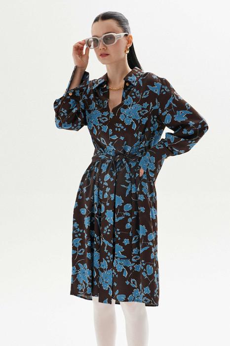 Платье прямого силуэта из приятной ткани. Рукав втачной, по низу широкая манжета с застёжкой на запонки. По переду: средний шов, V-образный вырез, воротник рубашечного кроя на стойке, к которой пристегивается на пуговицы декоративная деталь - цепочка. По спинке кокетка, небольшая сборка от кокетки по центру. К платью прилагается съёмный пояс.