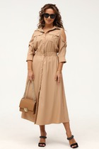 Платье свободного кроя из шифоновой ткани. Рукав втачной, до линии локтя по верхней части рукава сборка, по низу рукава резинка. По горловине воротник рубашечного типа на завязку и фигурный вырез в форме капли. Платье по линии талии отрезное, на резинке. По юбке платья притачной волан на сборку. В комплектацию входит пояс из экокожи и съёмный бант, который также можно завязать на талии как пояс.