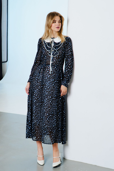Платье полуприлегающего силуэта выполнено из шифона, по юбке трикотажная подкладка. Рукав втачной, по низу рукава манжета на застёжку петли и пуговицу. Округлый вырез горловины, воротник съёмный на завязку, по переду планка с рюшами с пришивным кружевом, застёжка на петли и пуговицы. Платье отрезное по линии талии, по спинке для удобства в носке в шов вставлена резинка. По линии талии юбка собрана на сборку.