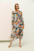 Платье полуприлегающего силуэта выполнено из ткани тафта. Линия плеча спущена. Рукав 3/4 по низу рукава складки. Воротник пиджачного типа с воротником и лацканом, застёжка двубортная на петли и пуговицы, Линия талии отрезная, от подреза по лифу и юбке талии глубокие складки. В боковых швах карманы, по спинке в подрез вставлена резинка.