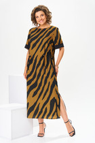 Женственное платье прямого силуэта выполнено из трикотажного полотна. Округлая горловина. Длинный втачной рукав со спущенным плечом. Перед дополнен застроченными складками. Низ ровный, сзади разрез.