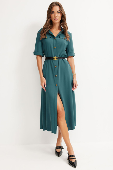полуприлегающего силуэта. Воротник стояче-отложной с застежкой по центру на петли и пуговицы. Рукав втачной, длиной до локтя, по
