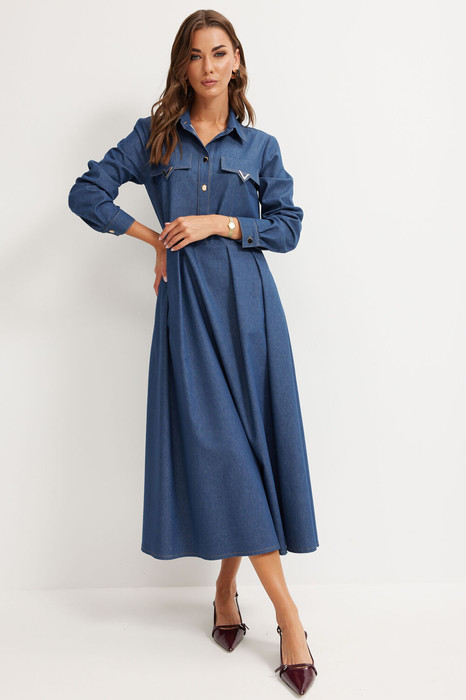 Платье прямого силуэта расширенное к низу из плательной ткани. Воротник рубашечного типа с застежкой по центру на петли и пуговицы. Платье отрезное по  линии талии. От подреза на талии вниз заложены декоративные складки. В боковых швах карманы. По переду на лифе нагрудные вытачки и декоративные клапаны. В комплект входит пояс из основной ткани. Обращаем ваше внимание, что фурнитура может отличаться от фото.