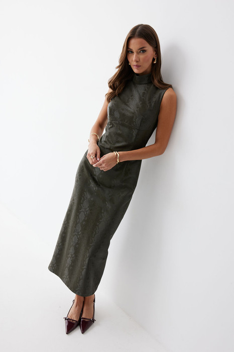 Платье прилегающего силуэта из экокожи длиной миди. Горловина-стойка. Спереди под грудью подрез, нагрудные и талиевые вытачки. На спинке в центральном шве потайная молния, по низу шлица. На спинке платья талиевые вытачки.