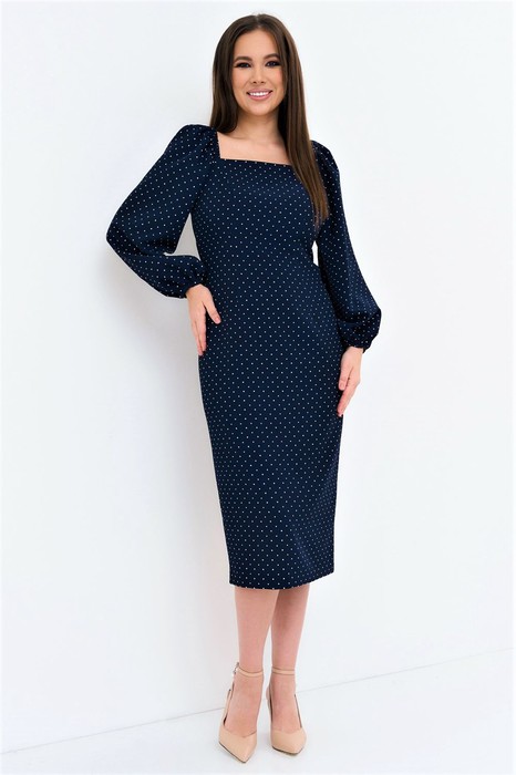 Элегантное платье полуприлегающего силуэта. Объемный рукав у основания дополнен эластичной тесьмой. По спинке потайная молния и разрез. Длина платья 115см. Длина рукава 45см.