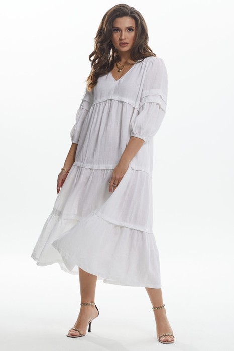 Платье свободное с завышенной талией. Юбка из трех ярусов, сверху со сборкой со складкой по низу каждого волана. По переду полочки кокетка-погон, из кокетки