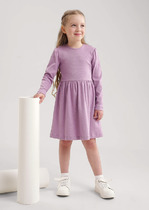 Платье из хлопкового трикотажа, отрезное по линии талии со сборкой. Круглый вырез горловины. Рукав длинный, пройма декорирована небольшими крылышками.