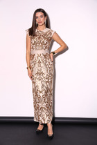 Стильное платье полу-прилегающего силуэта, выполнено из трикотажного полотна, хорошо тянется. Горловина-стойка, на обтачке, также на полочке обработаны нагрудные вытачки. Спинка платья со средним швом и вытачками, рукава на платье съемные выполнены из сетки с принтом.  В качестве декора к платью прилагается съемное украшение в виде броши-цветок. Стильное платье с ненавязчивым декором отлично подойдет на каждый день и мероприятия.