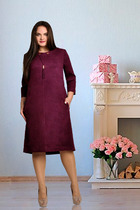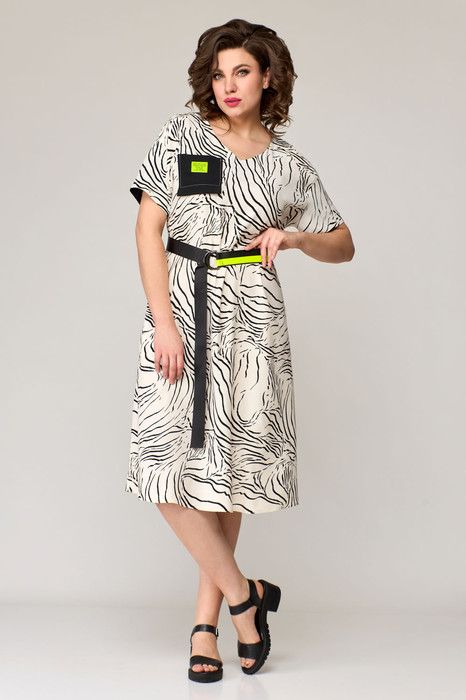 Платье выполнено из вискозного полотна, максимально комфортного и легкого. По переду v-образный вырез горловины  и накладной карман с декоративным нашивным элементом. Рукав одношовный, линия плеча слегка спущенная. Спинка разрезная по среднему шву, шов декорирован нашивным элементом. В комплект входит пояс. Длина платья 111 см. Длина рукава от горловины 34.