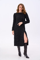 Платье из ЭКО-кожи на хлопковой основе. По переду застежка молния и декоративная молния выходящая из плеча. В боковых швах карманы. Рукав втачной одношовный со сборкой и манжетой по низу. Манжета застегивается на метлю и пуговацу. Длина платья 104 см, длина рукава 60 см.