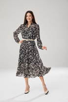 Платье женское полуприлегающего силуэта, без подкладки. V-образный вырез горловины. По переду нагрудные вытачки и подрез чуть выше линии талии. От подреза идут вставки из хлопка ассиметричные по длине. Синка со средним швом, талевыми вытачками и разрезом по низу. Застежка по спинке на потайную тесьму-молнию. Рукав втачной двухшовный со съемной манжетой из хлопка. Манжета застегивается на 4 пуговицы и петли. Длина платья 105см , длина рукава с манжетой 51см.