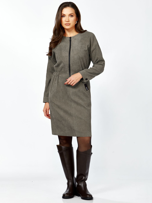 Платье полуприлегающего силуэта из мягкой, комфортной штруксовой ткани. Рукав спущенный, длинный, на манжете с застёжкой на 1 петлю и 1 пуговицу, разрезом. Горловина круглая, застёжка на тесьму-молнию контрастного цвета до талии. По талии подрез, по бокам спереди вставлена резинка, верхняя часть платья имитирует бомбер. Карманы- наклонные листочки, расположены на уровне бёдер по переднему полотнищу юбки, на левой листочке настрочена нашивка контрастного цвета. Перед платья с декоративными подрезами и отстрочкой. Спинка отрезная по талии, на резинке, со средним швом и разрезом по низу.