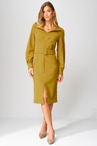 Платье женское прилегающего  силуэта. Головина v-образная. Перед платья со средним швом, заканчиающимся разрезом. Спинка со средним швом, в который вшита потайная молния. Горловина и пройма изделия обработаны декоративной тесьмой. Платье без подкладки.